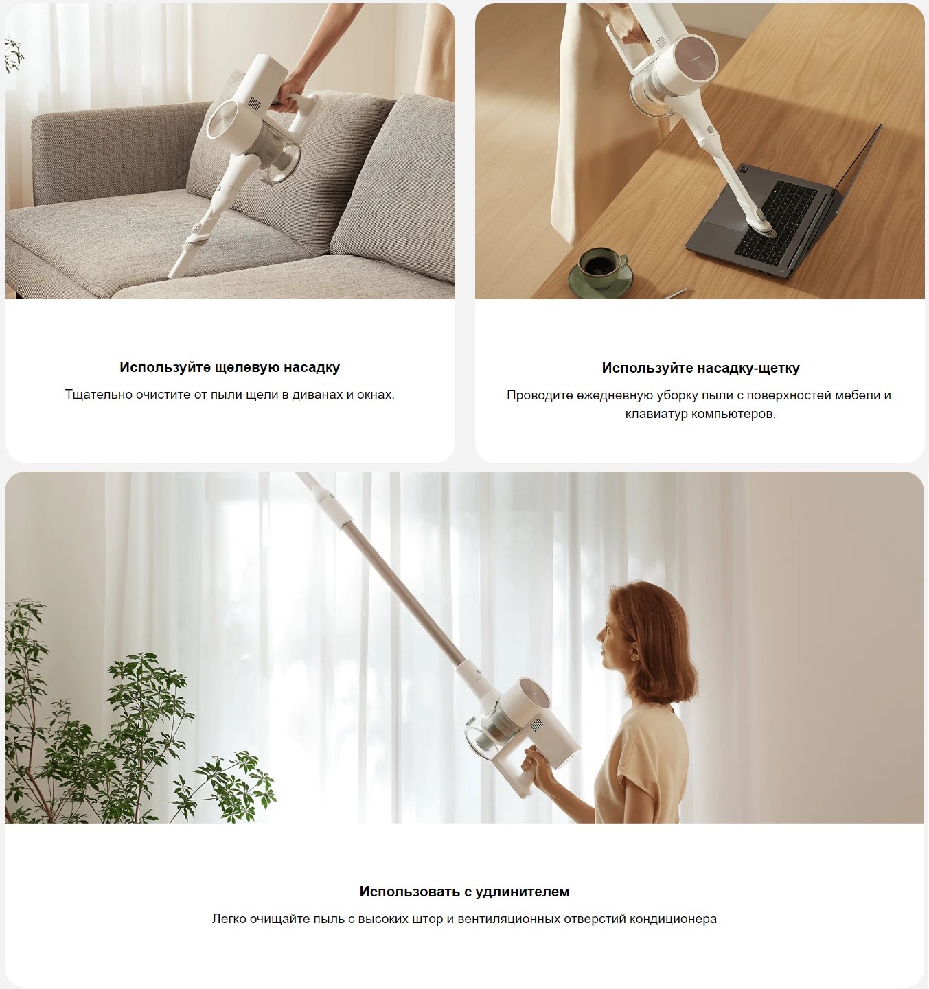 Удаляйте скрытую пыль из щелей, плавающую пыль на поверхностях и пыль, скопившуюся в возвышенных местах, с легкостью, переключая насадку по мере необходимости, не оставляя слепых зон.