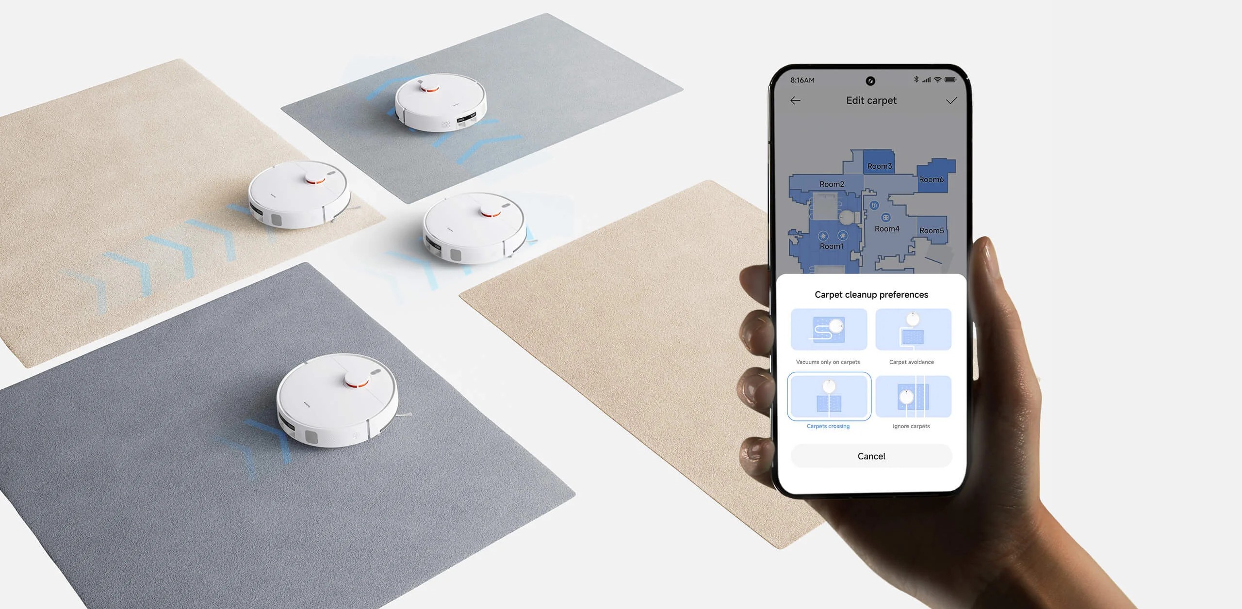 Лазерный сканер быстро создаёт карту помещения с точным зонированием. В приложении Xiaomi Home доступна 3D-визуализация, сохранение карт нескольких этажей и настройка виртуальных стен, зон уборки или запрета.